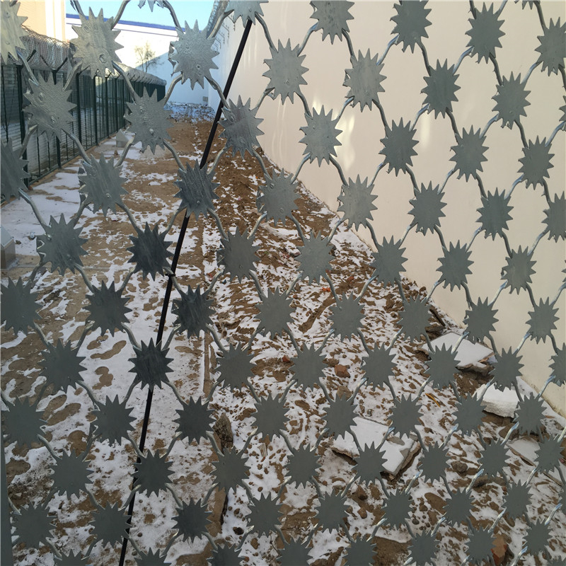 监狱Y型柱钢网墙-监狱防爬钢网墙-监狱梅花刺钢网墙,一般监狱防爬太阳花钢网墙高度3--5米,立柱跨度为2.5米--3米。是由防盗美格网加焊防爬刺片而成,美格网的网孔一般为:100X100mm,丝径为:5-8mm,刺片直径50-150mm,形状似太阳,四周布满刺尖。焊接在美格网每一个交接点处,是由二氧化碳保护焊进行焊接的,网边框为20X30mm、40X60mm、镀锌方管,壁厚不得少于1.5mm,然后把焊接打磨好的边框与网片连接,最后经过静电喷涂就算成品了。