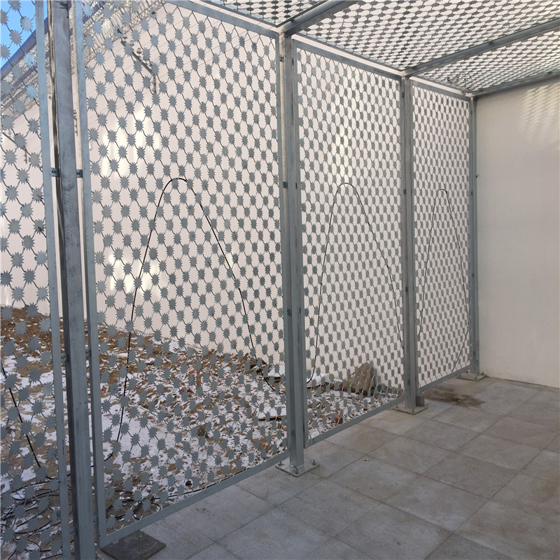 蛇腹型刀刺网由锐利尖角刀片和芯线组成,刀刺、刀型整齐、刀片锐利、排列均匀致密、连接牢固。刀刺网BTO-22刀型,刺圈直径600mm,芯丝直径2.5mm304不锈钢丝,排列密度不小于10圈/每米,相邻每圈间距不大于15cm,刀片为304不锈钢板冲压的尖锐菱形,刀长21mm、宽15mm,厚0.5mm,扎丝用1.2mm304不锈钢丝,固定拉丝采用8号镀锌铁丝。