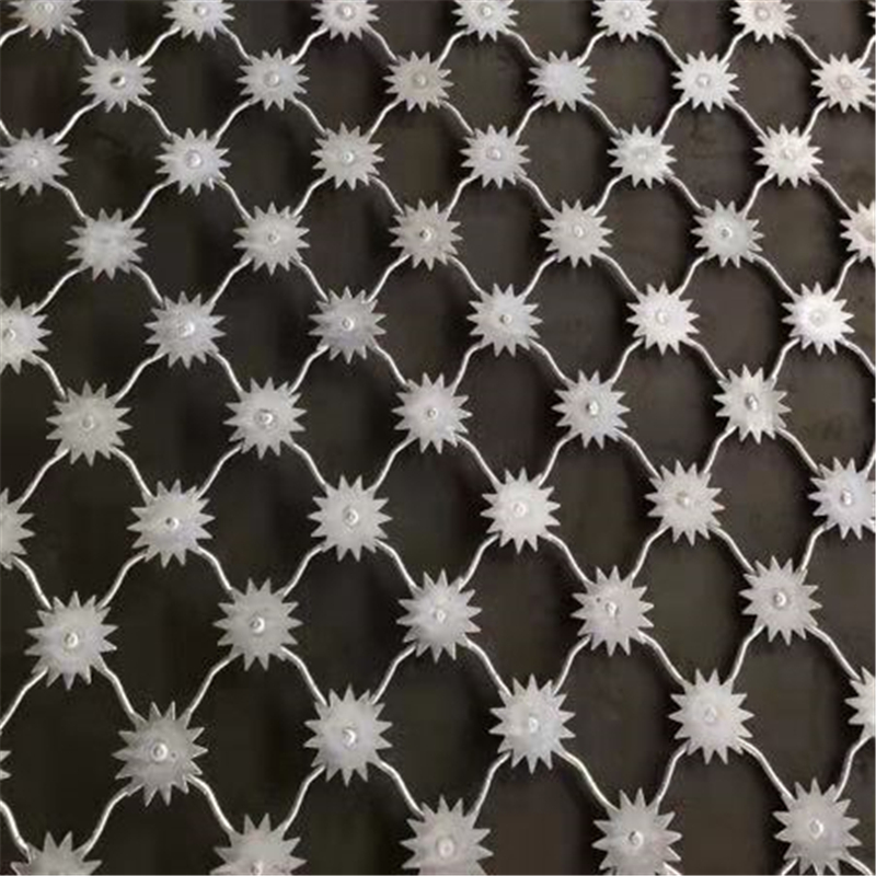 5、刀片滚网、拉丝、卡扣,均采用不锈钢材质。刀刺网安装固定卡扣整体调正,使刀刺网不出现拧转情况,刀刺刺圈分布均匀,每隔30-40cm与拉丝固定;分段连接处需将两端刀刺网做连接固定,刀刺网固定点需紧锁不得出现松动、脱落现象;刀刺网安装与隔离网平行,上下左右均成直线延伸,转角处需做加密加固处理。