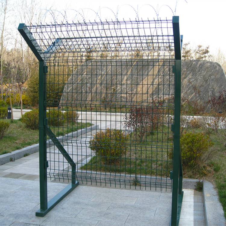 机场围网(机场护栏网)主要用V型支架立拄,加强型焊接片网,安全防盗连接件和热镀锌刀片刺笼组成强度和安全防御性级别很高.近年来,被广泛应用在机场,军事基地等高安全场所.注:如果在机场护栏网顶部加装刀片刺丝,刀片刺绳后又很好的增强了安全防护性能.采用电镀,热镀,喷塑,浸塑等防腐形式,具有很好的抗老化,抗晒,耐候等特点.其产品造型美观,花色多样,既起到围栏作用,又起到美化作用.由于具有安全性高,防攀爬能力好,网片连接方式采用特制SBS紧扣件,有效防止人为的破坏性拆卸,横向四道折弯加强筋,使网面强度显著增加